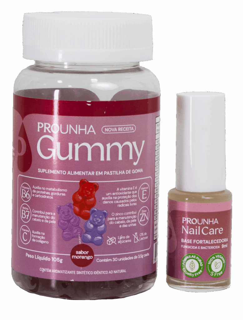 Também trabalhamos com produtos da marca Prounha, como o Prounha Gummy, um suplemento alimentar em gomas que contribui para unhas mais saudáveis, e o Prounha Nail Care, um fortalecedor de unhas de uso tópico. São alternativas que podem ser indicadas como apoio ao tratamento podológico, conforme a necessidade de cada cliente.