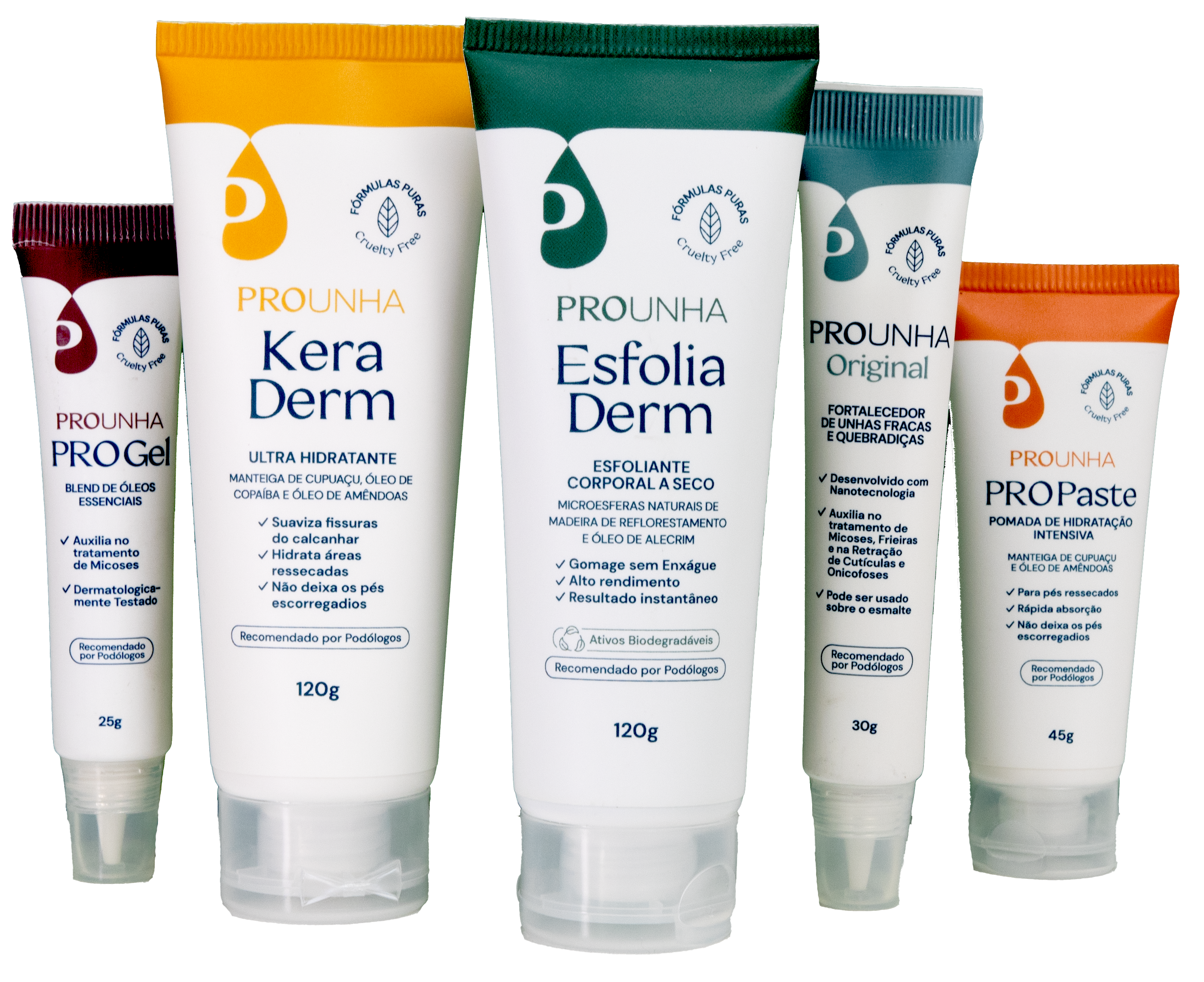 A linha dermocosmética da Prounha conta com opções como o Kera Derm (hidratante intenso), o Esfolia Derm (esfoliante corporal a seco), o tradicional Prounha Original (fortalecedor de unhas), além do PROPaste e do PROGel, que atuam na regeneração e proteção da pele. Esses produtos são desenvolvidos com ativos eficazes, indicados por profissionais e podem ser recomendados como parte do cuidado complementar em casa.