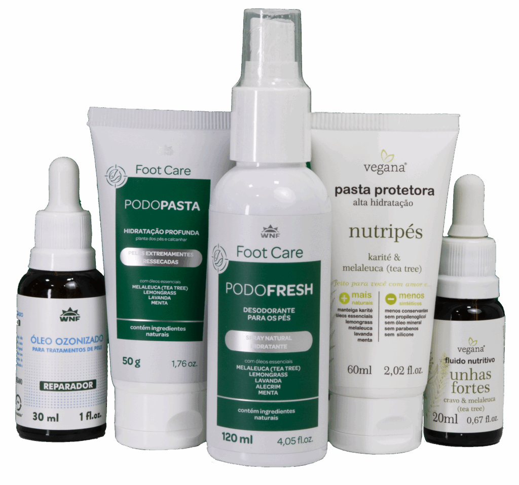 Na Plenna Podologia Barueri, possuímos alguns produtos das marcas WNF e Vegana, voltadas para cuidados com os pés e fortalecimento das unhas. Temos o PodoFresh (desodorante para os pés), a Podopasta (hidratação profunda) e o Óleo Ozonizado Reparador da WNF, além da Pasta Protetora Nutripés, e o Fluído Nutritivo Unhas Fortes da marca Vegana, que contam com os ativos naturais melaleuca, karité e tea tree. Esses produtos podem auxiliar nos cuidados diários em casa, complementando os tratamentos realizados em consultório.